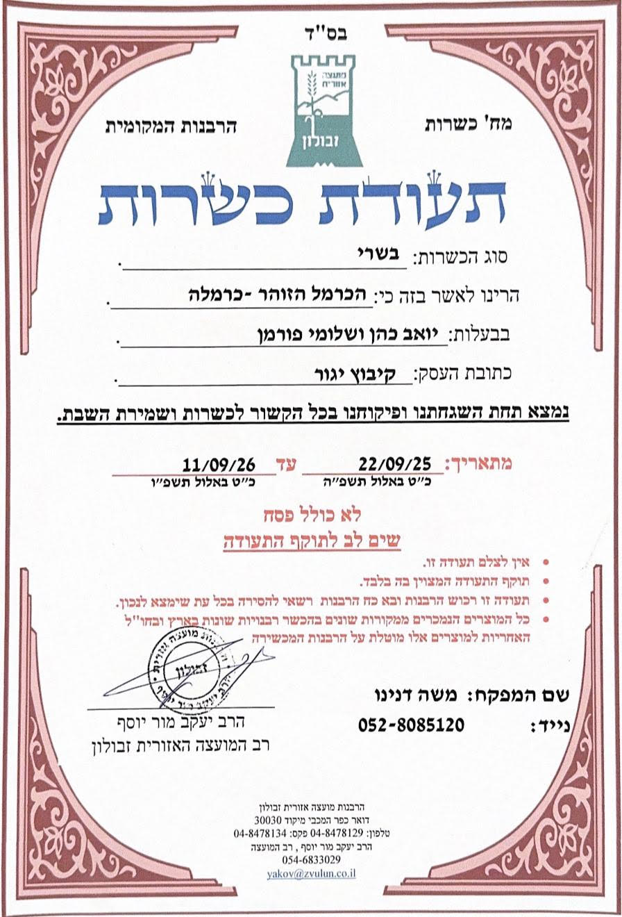 בידי הזהב של שף הבית, נושא המטבח של כרמלה דגל של אהבה לחקלאי המקום, לאדמת העמק וליישובים הכפריים סביב. הבשר מפורק ומיושן בקצביה, הלחם והקינוחים נאפים במקום והתפריט שפע, צבע וטעמים וברמה הגבוהה ביותר.